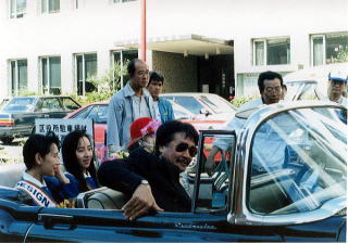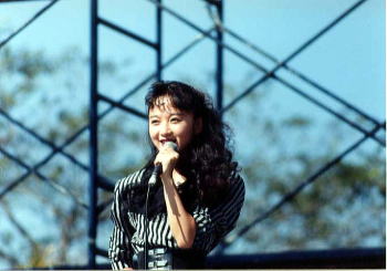 デコレ−ショントラック。通称デコトラですがこの車のランプは少し多すぎませんか?前面のグリル上にまでこんなにランプつけてしまったらエンジンを冷却するどころか逆に熱もってしまうと思うのですが… ステ−ジ上でマイクを持つ小百合ちゃん。 |
